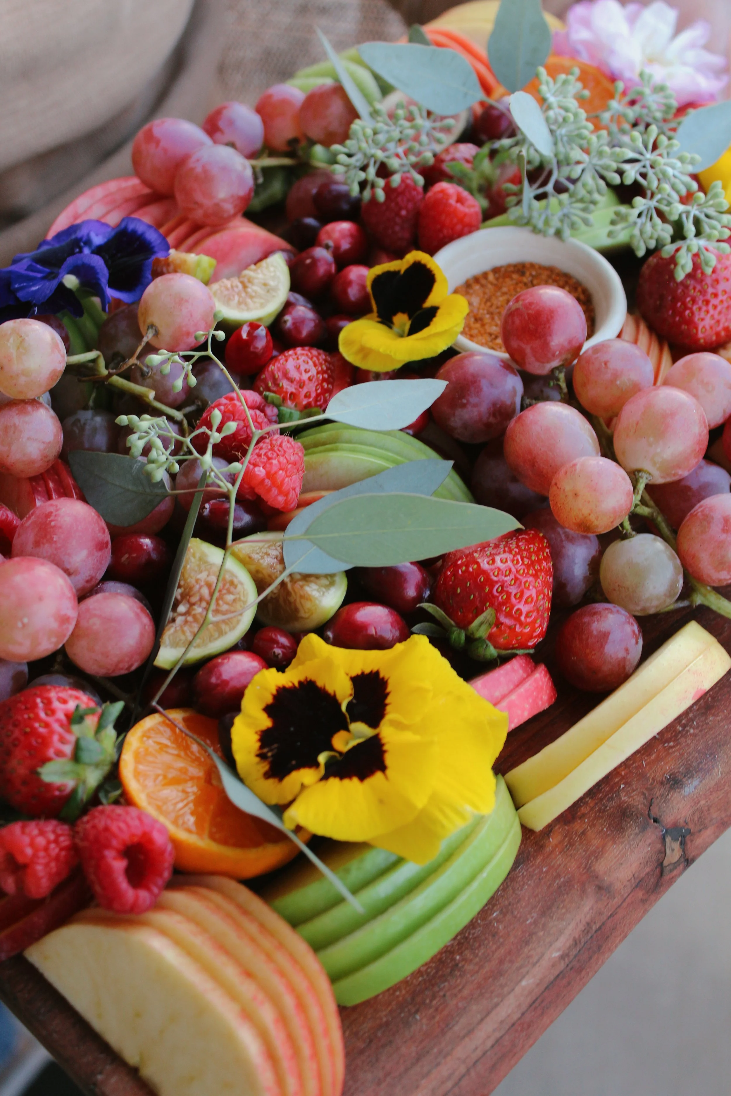 • Every item on our boards is edible — even the flowers and herb garnishes! We grow our own pansies during the winter to ensure they’re safe to eat. They have a light, grassy flavor, but you can always leave them off if you prefer.